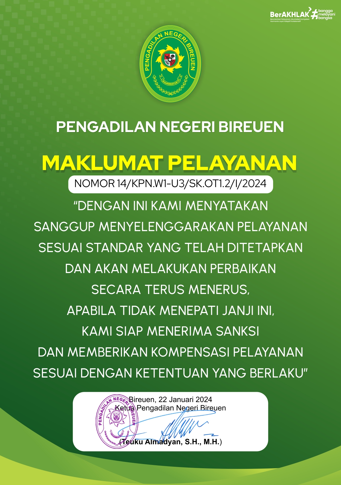 DENGAN INI, KAMI BERJANJI AKAN MEMBERIKAN PELAYANAN SESUAI DENGAN STANDAR PELAYANAN PERADILAN YANG TELAH DITETAPKAN, DAN APABILA TIDAK MENEPATI JANJI INI, KAMI SIAP MENERIMA SANKSI SESUAI DENGAN PERATURAN PERUNDANG-UNDANGAN YANG BERLAKU